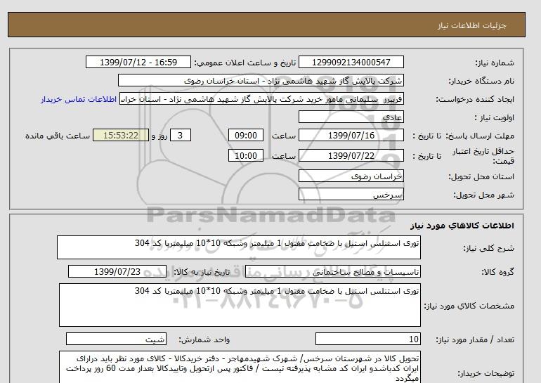 نام دستگاه خریدار:شرکت پالایش گاز شهید هاشمی نژاد - استان خراسان رضوی