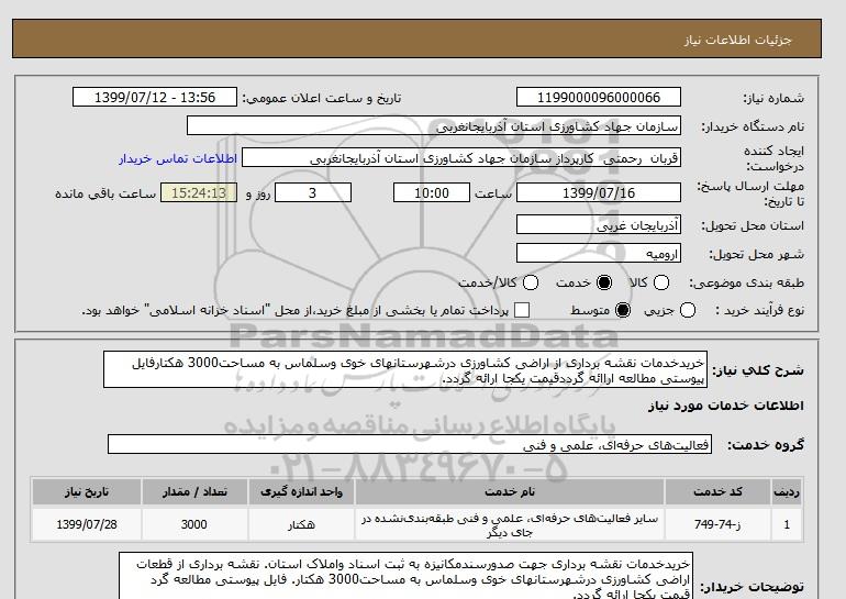 شرح کلی نیاز: خریدخدمات نقشه برداری از اراضی کشاورزی درشهرستانهای خوی وسلماس به مساحت3000 هکتارفایل پیوستی مطالعه اراائه گرددقیمت یکجا ارائه گردد.