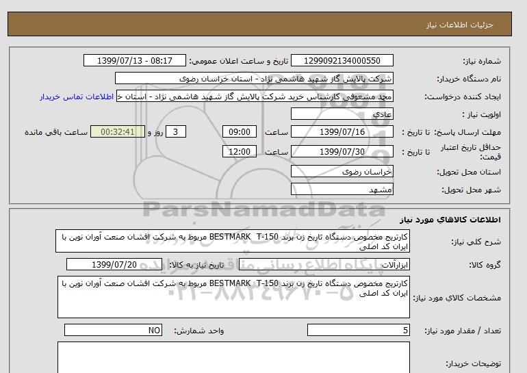 نام دستگاه خریدار:شرکت پالایش گاز شهید هاشمی نژاد - استان خراسان رضوی