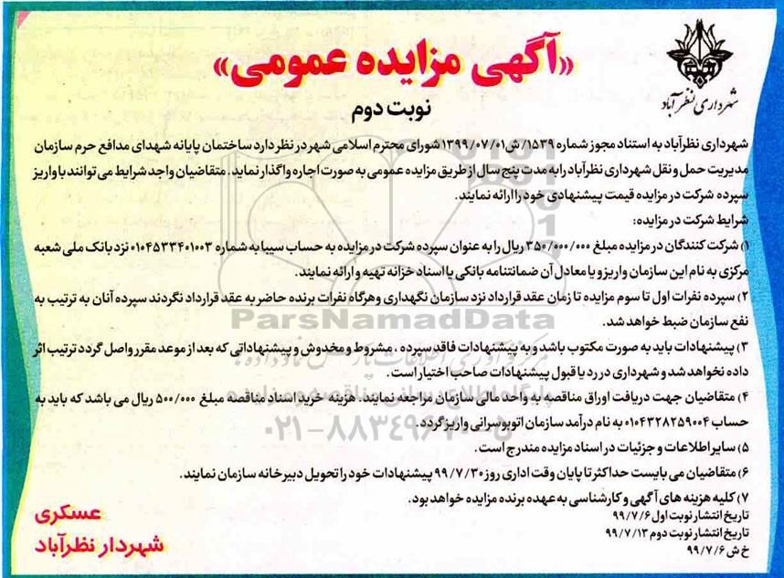 شهرداری نظرآباد به استناد مجوز شماره 1539/ش 99.7.1 شورای محترم اسلامی شهر در نظر دارد ساختمان پایانه شهدای مدافع حرم سازمان مدیریت حمل و نقل شهرداری نظرآباد را به مدت پنج سال از طریق مزایده عمومی به صورت اجاره واگذار نماید.
