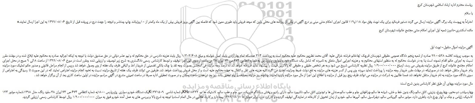 به موجب پرونده کلاسه 9900528 صادره از شعبه پنجم دادگاه عمومی حقوقی شهرستان قرچک لها:خانم فرشته خزائی علیه: آقای محمد نظرپور محکوم علیه محکوم است به پرداخت 314 عددسکه تمام بهارآزادی بابت اصل خواسته و مبلغ 1/302/608 ریال بابت هزینه دادرسی در حق محکوم له و نیم عشر دولتی در حق صندوق دولت با توجه به اینکه اجرائیه صادره به محکوم علیه ابلاغ شده و در مهلت مقرر نسبت به اجرای حکم اقدام ننموده است بنا به در خواست محکوم له به منظور استیفای محکوم به و هزینه اجرایی اموال متعلق به نامبرده که شامل یک دستگاه خودرو سواری پژو پارس به شماره انتظامی 674 ص 73 ایران 38 می باشد، از سوی این اجرا توقیف و توسط کارشناس رسمی دادگستری به شرح زیر توصیف و ارزیابی شده ومقرر است در مورخ 1399/08/06 از ساعت 8 الی 9 صبح در محل اجرای احکام مجتمع خانواده کرج از طریق مزایده بفروش می رسد، ازمبلغ 1/900/000/000 ریال نظریه کارشناسی شروع می شود و به هر شخص حقیقی و حقوقی که بالاترین قیمت را پیشنهاد نماید فروخته خواهد شد ده درصد وجه مزایده فی المجلس بصورت وجه نقد یا چک بانکی تضمینی از خریدار اخذ و الباقی ظرف یک هفته از وی وصول خواهد شد و پس از انجام مراحل قانونی و صدور حکم تملیک مورد مزایده بنام خریدار منتقل خواهد شد در صورتیکه در مهلت مقرر خریدار وجه مزایده را پرداخت ننماید سپرده وی پس از کسر هزینه های مزایده به نفع دولت ضبط ومزایده تجدید می گرددکلیه هزینه های نقل و انتقال به عهده محکوم علیه است و از محل فروش پرداخت خواهد شد. طرفین می توانند ظرف یک هفته از تاریخ مزایده نسبت به نحوه انجام مزایده اعتراض نمایند که در این صورت تا رسیدگی به اعتراض از سوی دادگاه مورد مزایده به نام خریدار منتقل نخواهد شد ضمنا طالبین به شرکت در مزایده می توانند ظرف پنج روز قبل از مزایده با اطلاع این اجرا از مال مورد مزایده بازدید نمایند. چنانچه روز مزایده مصادف با ایام تعطیل باشد روز بعد در همان ساعت ومکان و در صورت تعطیلی اداره صرفا در ساعت تعیینی مندرج در آگهی مراسم مزایده در اولین ساعت کاری بعد از آن برگزار خواهد شد .