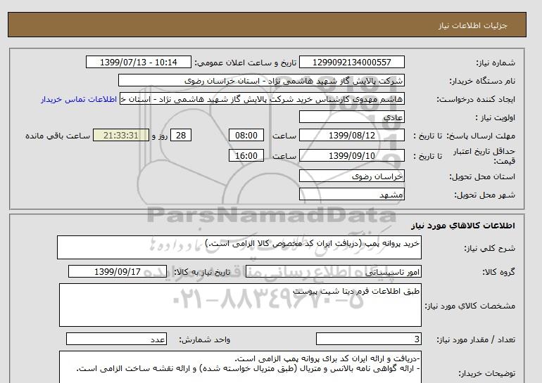 نام دستگاه خریدار:شرکت پالایش گاز شهید هاشمی نژاد - استان خراسان رضوی