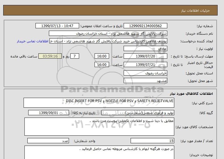 شرح کلی نیاز: SAFETY RELIETVALVE و NOZZLE FOR PSV و DISC INSERT FOR PSV