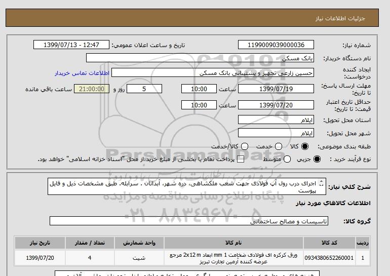 شرح کلی نیاز: اجرای درب رول آپ فولادی جهت شعب ملکشاهی، دره شهر، آبدانان . سرابله. طبق مشخصات ذیل و فایل پیوست -ضخامت ورق درب یک میلیمتر-رنگ درب سفیدو بدون پانچ