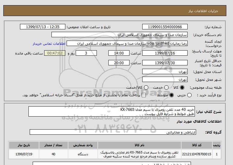 شرح کلی نیاز: خرید 40 عدد تلفن رومیزی با سیم مدل KX-7665