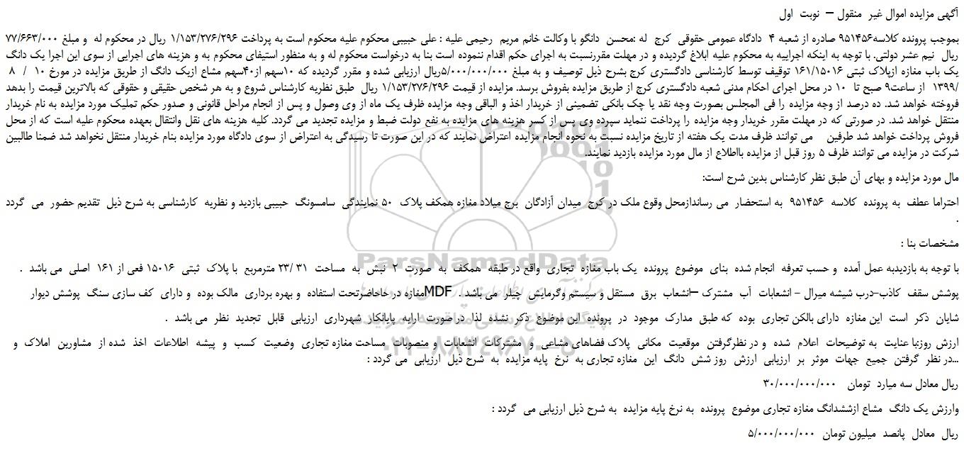 بموجب پرونده کلاسه951456 صادره از شعبه 4 دادگاه عمومی حقوقی کرج له :محسن دانگو با وکالت خانم مریم رحیمی علیه : علی حبیبی محکوم علیه محکوم است به پرداخت 1/153/276/296 ریال در محکوم له و مبلغ 77/663/000 ریال نیم عشر دولتی. با توجه به اینکه اجراییه به محکوم علیه ابلاغ گردیده و در مهلت مقررنسبت به اجرای حکم اقدام ننموده است بنا به درخواست محکوم له و به منظور استیفای محکوم به و هزینه های اجرایی از سوی این اجرا یک دانگ یک باب مغازه ازپلاک ثبتی 161/15016 توقیف توسط کارشناسی دادگستری کرج بشرح ذیل توصیف و به مبلغ 5/000/000/000ریال ارزیابی شده و مقرر گردیده که 10سهم از40سهم مشاع ازیک دانگ از طریق مزایده در مورخ 10 / 8 /1399 از ساعت9 صبح تا 10 در محل اجرای احکام مدنی شعبه دادگستری کرج از طریق مزایده بفروش برسد. مزایده از قیمت 1/153/276/296 ریال طبق نظریه کارشناس شروع و به هر شخص حقیقی و حقوقی که بالاترین قیمت را بدهد فروخته خواهد شد. ده درصد از وجه مزایده را فی المجلس بصورت وجه نقد یا چک بانکی تضمینی از خریدار اخذ و الباقی وجه مزایده ظرف یک ماه از وی وصول و پس از انجام مراحل قانونی و صدور حکم تملیک مورد مزایده به نام خریدار منتقل خواهد شد. در صورتی که در مهلت مقرر خریدار وجه مزایده را پرداخت ننماید سپرده وی پس از کسر هزینه های مزایده به نفع دولت ضبط و مزایده تجدید می گردد. کلیه هزینه های نقل وانتقال بعهده محکوم علیه است که از محل فروش پرداخت خواهد شد طرفین می توانند ظرف مدت یک هفته از تاریخ مزایده نسبت به نحوه انجام مزایده اعتراض نمایند که در این صورت تا رسیدگی به اعتراض از سوی دادگاه مورد مزایده بنام خریدار منتقل نخواهد شد ضمنا طالبین شرکت در مزایده می توانند ظرف 5 روز قبل از مزایده بااطلاع از مال مورد مزایده بازدید نمایند.