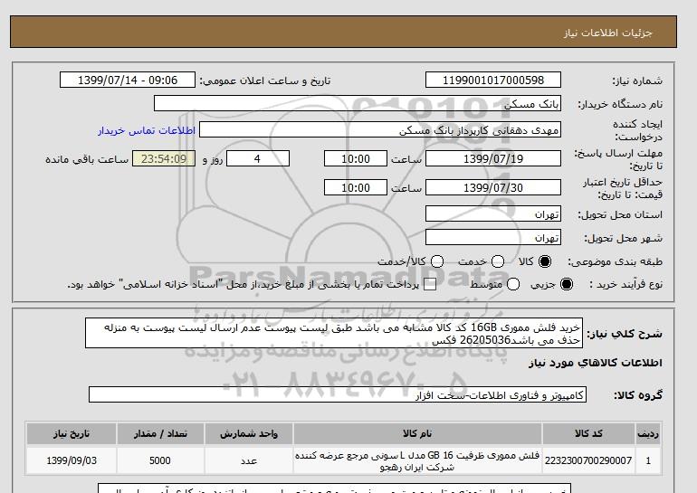 شرح کلی نیاز: خرید فلش مموری 16GB کد کالا مشابه می باشد طبق لیست پیوست عدم ارسال لیست پیوست به منزله حذف می باشد26205036 فکس