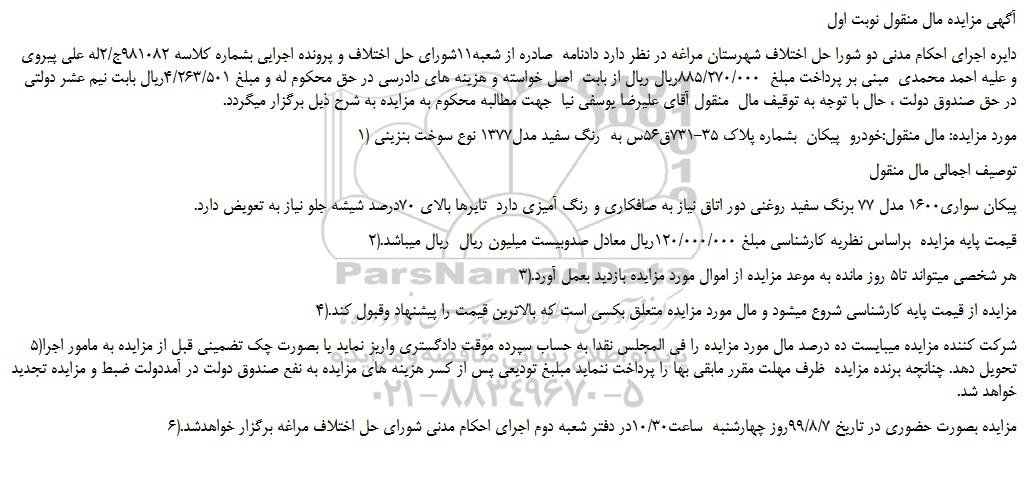 1) مورد مزایده: مال منقول:خودرو  پیکان  بشماره پلاک 35-731ق56س به  رنگ سفید مدل1377 نوع سوخت بنزینی