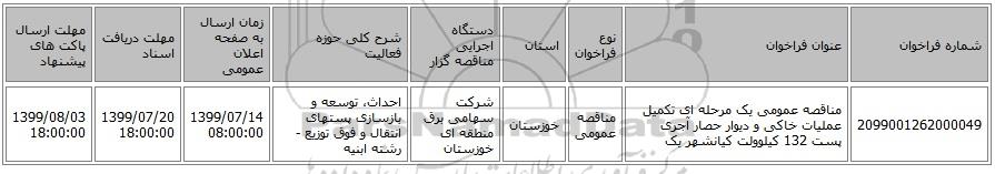 | 2099001262000049 | مناقصه عمومی یک مرحله ای تکمیل عملیات خاکی و دیوار حصار آجری پست 132 کیلوولت کیانشهر یک | مناقصه عمومی | خوزستان | شرکت سهامی برق منطقه ای خوزستان | احداث، توسعه و بازسازی پستهای انتقال و فوق توزیع - رشته ابنیه | 1399/07/14 08:00:00 | 1399/07/20 18:00:00 | 1399/08/03 18:00:00 |