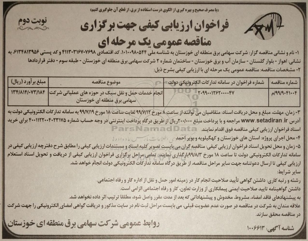 | 99/9041004/م | 2099001262000047 | انجام خدمات حمل و نقل سبک در حوزه های عملیاتی شرکت سهامی برق منطقه ای خوزستان | 134.814.073.184 |