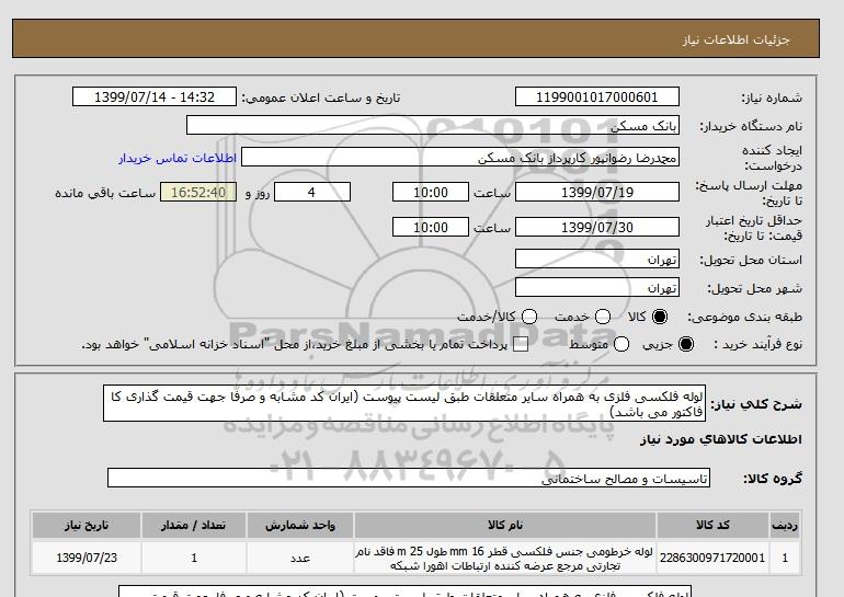 استعلام بها و موضوع استعلام استعلام لوله فلکسی فلزی به همراه سایر متعلقات طبق لیست پیوست (ایران کد مشابه و صرفا جهت قیمت گذاری کا فاکتور می باشد) به اطلاع کلیه شرکتها و افراد متخصص واجد شرایط میرساند، آگهی گذار در نظر دارد از طریق استعلام بها، نسبت به انتخاب و دریافت پیشنهادات اقدام نماید. این استعلام با کد آگهی ثبت شده در سامانه خبرگزاری پارس نماد : 2764975 منتشر شده است. مشخصات استعلام : تاریخ شروع استعلام: 1399/07/14 آخرین مهلت ارسال پیشنهاد قیمت : 1399/07/18 و محل اجرای پروژه : استان تهران میباشد. استعلام قیمت مورد درخواست : استعلام لوله فلکسی فلزی به همراه سایر متعلقات طبق لیست پیوست (ایران کد مشابه و صرفا جهت قیمت گذاری کا فاکتور می باشد) با دستهبندیهای تخصصی و گروه های مرتبط : تاسیسات ساختمانی, لوله و اتصالات, لوله های فولادی و چدنی, استعلام اطلاع رسانی میگردد. شرایط شرکت در استعلام آنلاین : ابتدا ثبت نام در سامانه استعلام پارس نماد و تکمیل مدارک موردنیاز و بارگذاری در سامانه رعایت تمامی ضوابط و الزامات مندرج در اسناد استعلام است.