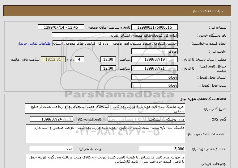 استعلام خرید ماسک سه لایه مورد تاییذ وزارت بهداشت - استعلام جهت استعلام بها و پرداخت نقدی از منابع داخلی, استعلام خرید ماسک سه لایه مورد تاییذ وزارت بهداشت - استعلام جهت استعلام بها و پرداخت نقدی از منابع داخلی