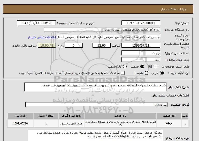 شرح کلی نیاز: شرح عملیات تعمیرات کتابخانه عمومی امیر کبیر روستای عمید آباد شهرستان ابهر-پرداخت نقدی
