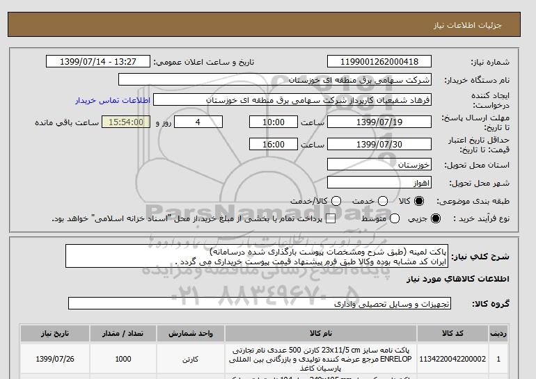 شرح کلی نیاز: پاکت لمینه (طبق شرح ومشخصات پیوست بارگذاری شده درسامانه)