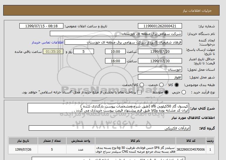 شرح کلی نیاز: کپسول گاز 50کیلویی sf6 (طبق شرح ومشخصات پیوست بارگذاری شده )
