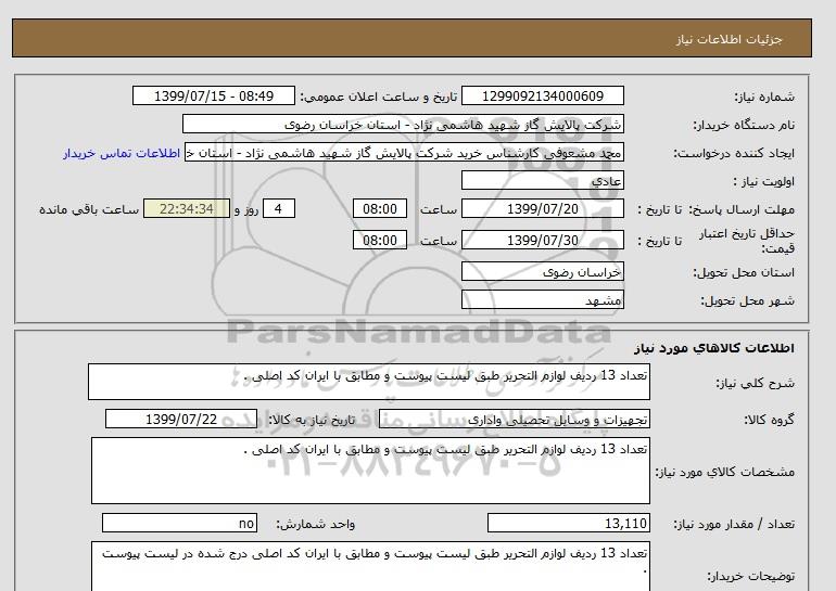 شرح کلی نیاز: تعداد 13 ردیف لوازم التحریر طبق لیست پیوست و مطابق با ایران کد اصلی .