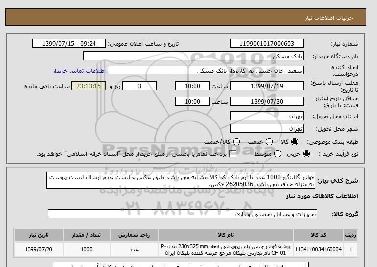 شرح کلی نیاز: فولدر گالینگور 1000 عدد با آرم بانک کد کالا مشابه می باشد طبق عکس و لیست عدم ارسال لیست پیوست به منزله حذف می باشد 26205036 فکس.