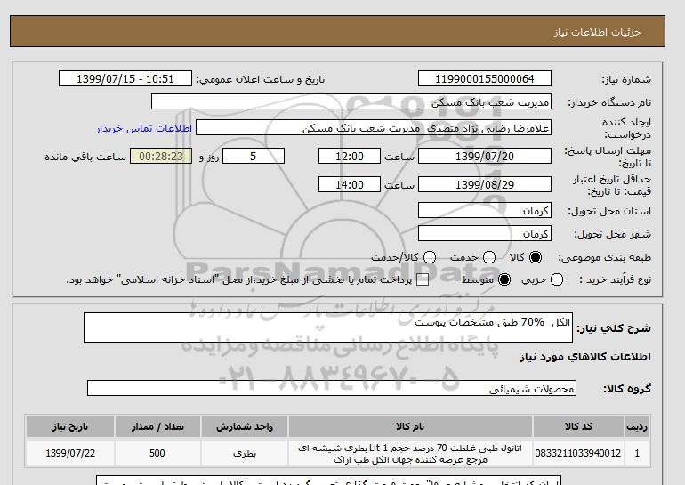 شرح کلی نیاز: الکل %70 طبق مشخصات پیوست
