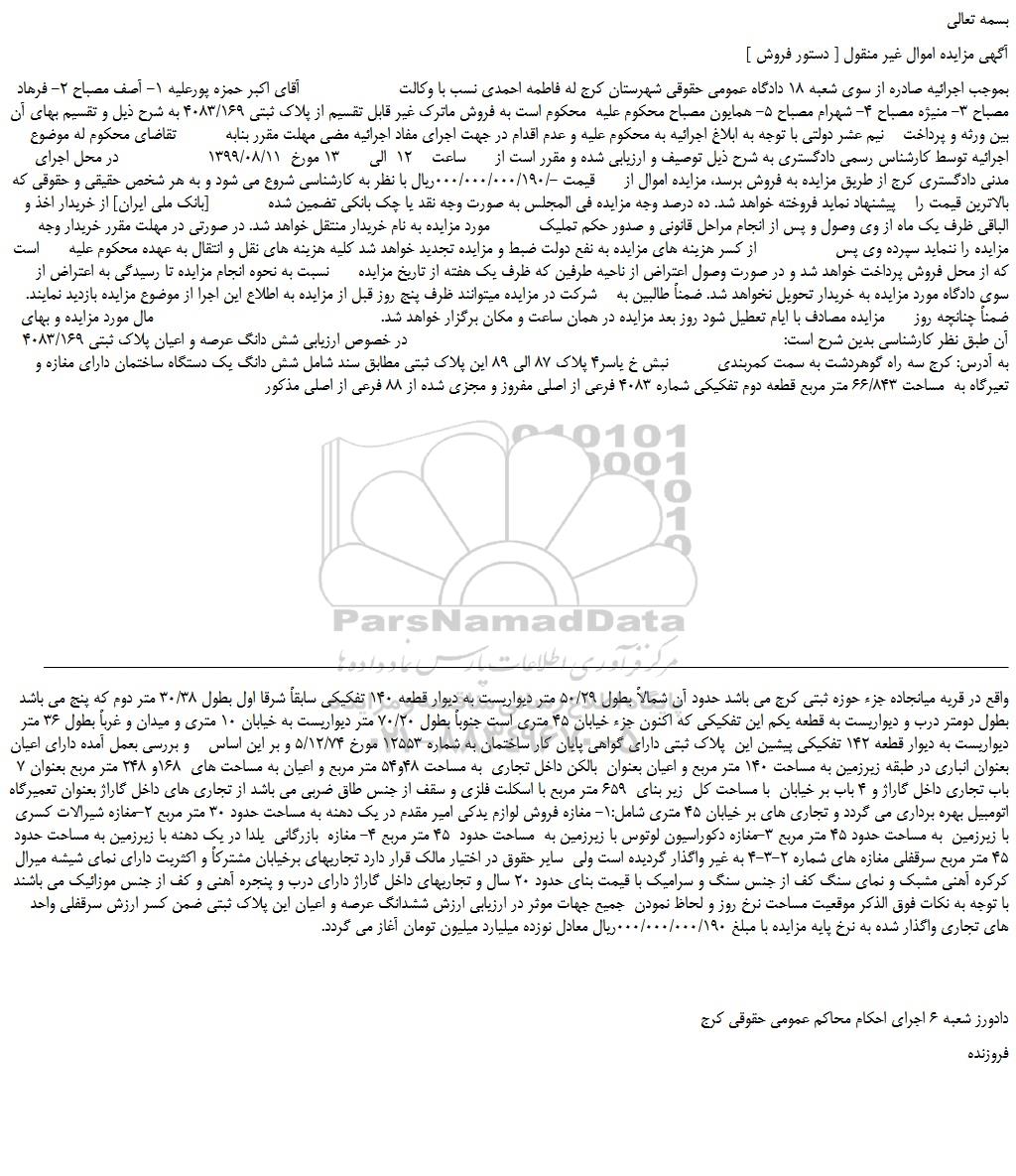 بموجب اجرائیه صادره از سوی شعبه 18 دادگاه عمومی حقوقی شهرستان کرج له فاطمه احمدی نسب با وکالت  آقای اکبر حمزه پورعلیه 1- آصف مصباح 2- فرهاد مصباح 3- منیژه مصباح 4- شهرام مصباح 5- همایون مصباح محکوم علیه  محکوم است به فروش ماترک غیر قابل تقسیم از پلاک ثبتی 4083/169 به شرح ذیل و تقسیم بهای آن بین ورثه و پرداخت    نیم عشر دولتی با توجه به ابلاغ اجرائیه به محکوم علیه و عدم اقدام در جهت اجرای مفاد اجرائیه مضی مهلت مقرر بنابه          تقاضای محکوم له موضوع اجرائیه توسط کارشناس رسمی دادگستری به شرح ذیل توصیف و ارزیابی شده و مقرر است از      ساعت    12  الی      13 مورخ  1399/08/11                  در محل اجرای مدنی دادگستری کرج از طریق مزایده به فروش برسد، مزایده اموال از      قیمت -/000/000/000/190ریال با نظر به کارشناسی شروع می شود و به هر شخص حقیقی و حقوقی که بالاترین قیمت را    پیشنهاد نماید فروخته خواهد شد. ده درصد وجه مزایده فی المجلس به صورت وجه نقد یا چک بانکی تضمین شده            [بانک ملی ایران] از خریدار اخذ و الباقی ظرف یک ماه از وی وصول و پس از انجام مراحل قانونی و صدور حکم تملیک          مورد مزایده به نام خریدار منتقل خواهد شد. در صورتی در مهلت مقرر خریدار وجه مزایده را ننماید سپرده وی پس از کسر هزینه های مزایده به نفع دولت ضبط و مزایده تجدید خواهد شد کلیه هزینه های نقل و انتقال به عهده محکوم علیه      است که از محل فروش پرداخت خواهد شد و در صورت وصول اعتراض از ناحیه طرفین که ظرف یک هفته از تاریخ مزایده      نسبت به نحوه انجام مزایده تا رسیدگی به اعتراض از سوی دادگاه مورد مزایده به خریدار تحویل نخواهد شد. ضمناً طالبین به    شرکت در مزایده میتوانند ظرف پنج روز قبل از مزایده به اطلاع این اجرا از موضوع مزایده بازدید نمایند. ضمناً چنانچه روز      مزایده مصادف با ایام تعطیل شود روز بعد مزایده در همان ساعت و مکان برگزار خواهد شد.                                              مال مورد مزایده و بهای آن طبق نظر کارشناسی بدین شرح است:                                                                            در خصوص ارزیابی شش دانگ عرصه و اعیان پلاک ثبتی 4083/169 به آدرس: کرج سه راه گوهردشت به سمت کمربندی          نبش خ یاسر4 پلاک 87 الی 89 این پلاک ثبتی مطابق سند شامل شش دانگ یک دستگاه ساختمان دارای مغازه و تعیرگاه به  مساحت 66/843 متر مربع قطعه دوم تفکیکی شماره 4083 فرعی از اصلی مفروز و مجزی شده از 88 فرعی از اصلی مذکور  واقع در قریه میانجاده جزء حوزه ثبتی کرج می باشد حدود آن شمالاً بطول 50/29 متر دیواریست به دیوار قطعه 140 تفکیکی سابقاً شرقا اول بطول 30/38 متر دوم که پنج می باشد بطول دومتر درب و دیواریست به قطعه یکم این تفکیکی که اکنون جزء خیابان 45 متری است جنوباً بطول 70/20 متر دیواریست به خیابان 10 متری و میدان و غرباً بطول 36 متر دیواریست به دیوار قطعه 142 تفکیکی پیشین این  پلاک ثبتی دارای گواهی پایان کار ساختمان به شماره 12553 مورخ 5/12/74 و بر این اساس    و بررسی بعمل آمده دارای اعیان بعنوان انباری در طبقه زیرزمین به مساحت 140 متر مربع و اعیان بعنوان  بالکن داخل تجاری  به مساحت 48و54 متر مربع و اعیان به مساحت های  168و 248 متر مربع بعنوان 7 باب تجاری داخل گاراژ و 4 باب بر خیابان  با مساحت کل  زیر بنای  659 متر مربع با اسکلت فلزی و سقف از جنس طاق ضربی می باشد از تجاری های داخل گاراژ بعنوان تعمیرگاه اتومبیل بهره برداری می گردد و تجاری های بر خیابان 45 متری شامل:1- مغازه فروش لوازم یدکی امیر مقدم در یک دهنه به مساحت حدود 30 متر مربع 2-مغازه شیرالات کسری با زیرزمین  به مساحت حدود 45 متر مربع 3-مغازه دکوراسیون لوتوس با زیرزمین به  مساحت حدود  45 متر مربع 4- مغازه  بازرگانی  یلدا در یک دهنه با زیرزمین به مساحت حدود 45 متر مربع سرقفلی مغازه های شماره 2-3-4 به غیر واگذار گردیده است ولی  سایر حقوق در اختیار مالک قرار دارد تجاریهای برخیابان مشترکا