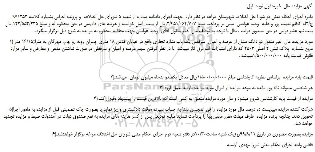 1) مورد مزایده: مال غیر منقول:دو دانگ مشاع از عرصه و اعیان سرقفلی یک باب مغازه تجاری واقع در خیابان قدس 18 متری چمران روبه رو چاپ مهرگان به متراژ16/15 متر مربع بشماره پلاک ثبتی 2 اصلی 2503 که دارای امتیازات آب برق گاز میباشد با در نظر گرفتن سهم عرصه و اعیان و سرقفلی در صورت نداشتن مدعی و معارض و سایر موارد قانونی قیمت پایه 1/500/000/000میباشد .