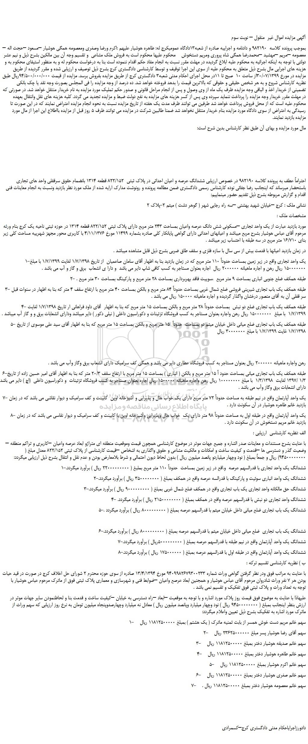3-ششدانگ حق مالکانه واحد تجاری یک باب تجاری واقع در همکف ضلع شمال غربی بمبلغ ( 9000000000 ریال ) برآورد میگردد.