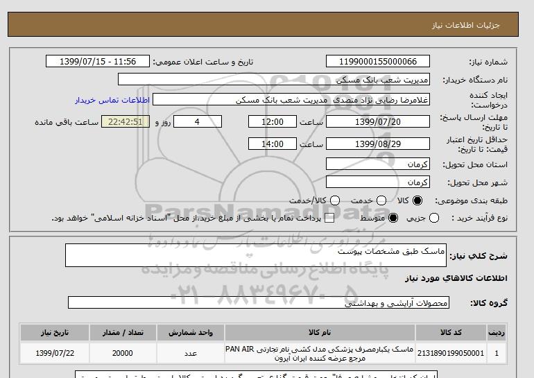 شرح کلی نیاز: ماسک طبق مشخصات پیوست