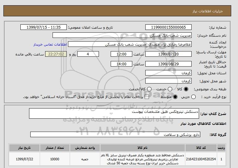 استعلام بها و موضوع استعلام استعلام دستکش نیتروتکس طبق مشخصات پیوست به اطلاع کلیه شرکتها و افراد متخصص واجد شرایط میرساند، آگهی گذار در نظر دارد از طریق استعلام بها، نسبت به انتخاب و دریافت پیشنهادات اقدام نماید. این استعلام با کد آگهی ثبت شده در سامانه خبرگزاری پارس نماد : 2768507 منتشر شده است. مشخصات استعلام : تاریخ شروع استعلام: 1399/07/15 آخرین مهلت ارسال پیشنهاد قیمت : 1399/07/19 و محل اجرای پروژه : استان کرمان میباشد. استعلام قیمت مورد درخواست : استعلام دستکش نیتروتکس طبق مشخصات پیوست با دستهبندیهای تخصصی و گروه های مرتبط : خدمات و تجهیزات آزمایشگاهی و پزشکی, لوازم بهداشتی, استعلام اطلاع رسانی میگردد. شرایط شرکت در استعلام آنلاین : ابتدا ثبت نام در سامانه استعلام پارس نماد و تکمیل مدارک موردنیاز و بارگذاری در سامانه رعایت تمامی ضوابط و الزامات مندرج در اسناد استعلام است.