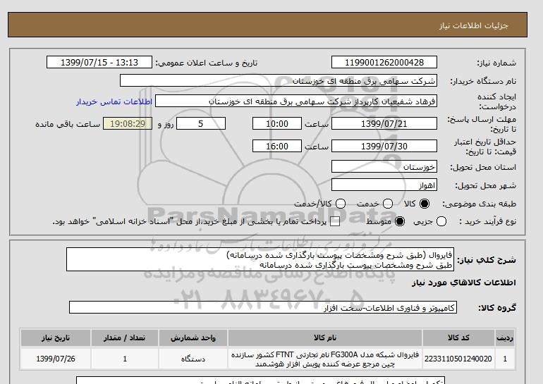 شرح کلی نیاز: فایروال (طبق شرح ومشخصات پیوست بارگذاری شده درسامانه)