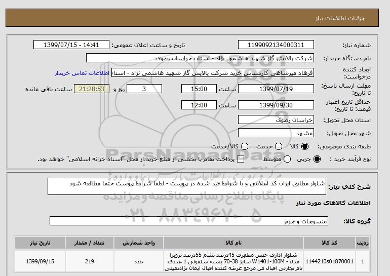 استعلام شلوار مطابق ایران کد اعلامی و با شرایط قید شده در پیوست - لطفا شرایط پیوست حتما مطالعه شود ؟