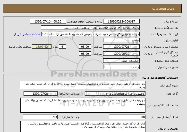 نام دستگاه خریدار:شرکت پالایش گاز شهید هاشمی نژاد - استان خراسان رضوی