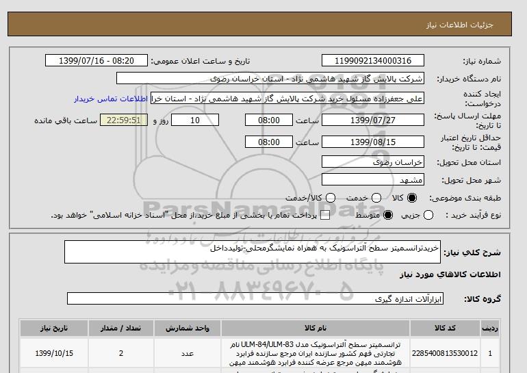 نام دستگاه خریدار:شرکت پالایش گاز شهید هاشمی نژاد - استان خراسان رضوی