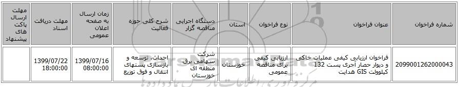 | 2099001262000043 | فراخوان ارزیابی کیفی عملیات خاکی و دیوار حصار آجری پست 132 کیلوولت GIS هدایت | ارزیابی کیفی برای مناقصه عمومی | خوزستان | شرکت سهامی برق منطقه ای خوزستان | احداث، توسعه و بازسازی پستهای انتقال و فوق توزیع | 1399/07/16 08:00:00 | 1399/07/22 18:00:00 |