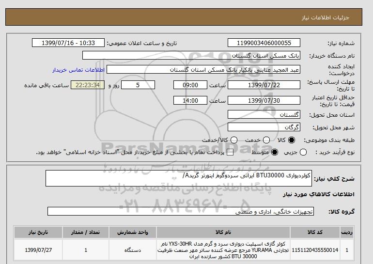 شرح کلی نیاز: کولردیواری BTU30000 ایرانی سردوگرم اینورتر گریدA/