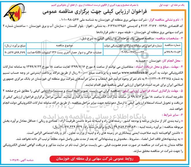 موضوع مناقصه: عملیات خاکی و دیوار حصار آجری پست 132 کیلوولت GIS هدایت
