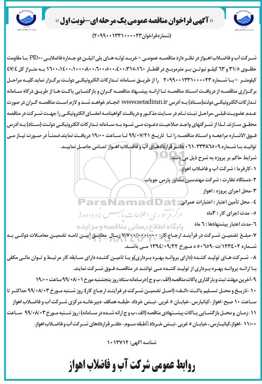 شرکت آب و فاضلاب اهواز در نظر دارد مناقصه عمومی خرید لوله های پلی اتیلن دو جداره فاضلابی pe100 با مقاومت حلقوی 31/5 و 63 کیلو نیوتن بر متر مربع در اقطار 160، 315، 400، 500، 600، 800، 1000، 1400، 1600 به متراژ کل 47/4 کیلومتر با شماره 2099001331000023 را از طریق سامانه تدارکات الکترونیکی دولت برگزار نماید. کلیه مراحل ارزیابی کیفی، از دریافت استعلام های ارزیابی کیفی تا ارانه استعلام های تکمیل شده  و اسناد و مدارک مربوطه از طریق درگاه سامانه تدارکات الکترونیکی دولت (ستاد) به آدرس ستاد ایران انجام خواهد شد و لازم است مناقصه گران در صورت عدم عضویت - قبلی، مراحل ثبت نام در سایت مذکور و دریافت گواهینامه امضای الکترونیکی را جهت شرکت در مناقصه محقق سازند.