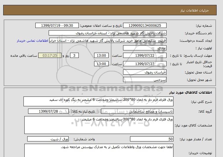 نام دستگاه خریدار:شرکت پالایش گاز شهید هاشمی نژاد - استان خراسان رضوی
