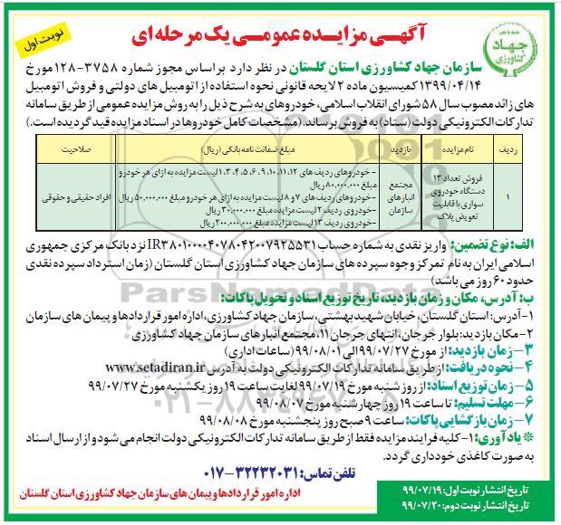 سازمان جهاد کشاورزی استان گلستان در نظر دارد براساس مجوز شماره 3758-128 مورخ 99.4.14 کمیسیون ماده 2 لایحه قانونی نحوه استفاده از اتومبیل های دولتی و فروش اتومبیل های زائد مصوب سال 58 شورای انقلاب اسلامی خودروهای به شرح ذیل را به روش مزایده عمومی از طریق سامانه تدارکات الکترونیکی دولت ستاد به فروش برساند.