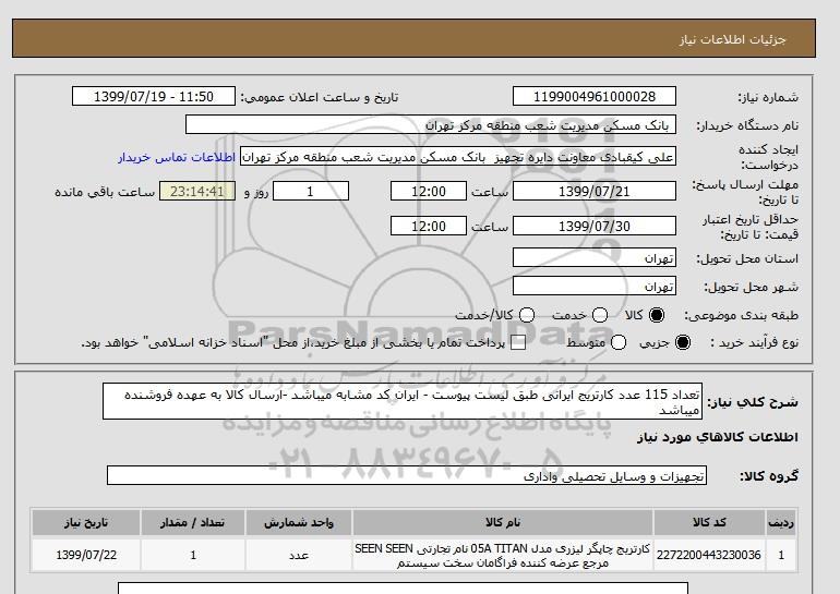 شرح کلی نیاز: تعداد 115 عدد کارتریج ایرانی طبق لیست پیوست - ایران کد مشابه میباشد -ارسال کالا به عهده فروشنده میباشد