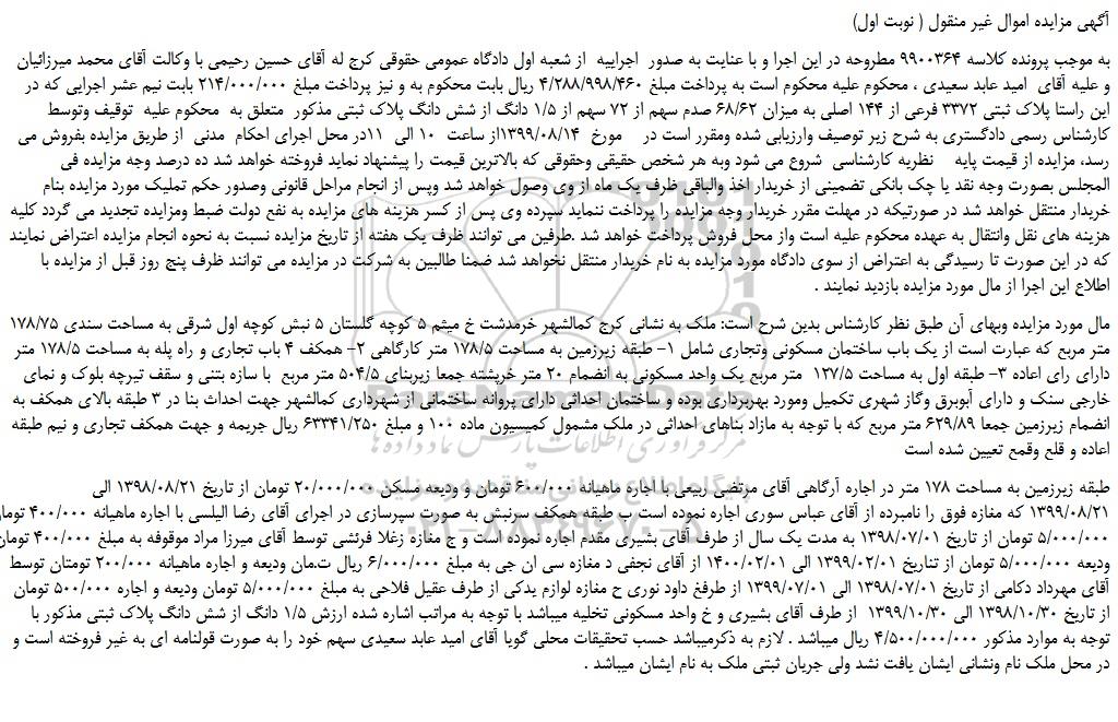 به موجب پرونده کلاسه 9900364 مطروحه در این اجرا و با عنایت به صدور  اجراییه  از شعبه اول دادگاه عمومی حقوقی کرج له آقای حسین رحیمی با وکالت آقای محمد میرزائیان و علیه آقای  امید عابد سعیدی ، محکوم علیه محکوم است به پرداخت مبلغ 4/288/998/460 ریال بابت محکوم به و نیز پرداخت مبلغ 214/000/000 بابت نیم عشر اجرایی که در این راستا پلاک ثبتی 3372 فرعی از 144 اصلی به میزان 68/62 صدم سهم از 72 سهم از 1/5 دانگ از شش دانگ پلاک ثبتی مذکور  متعلق به  محکوم علیه  توقیف وتوسط کارشناس رسمی دادگستری به شرح زیر توصیف وارزیابی شده ومقرر است در    مورخ  1399/08/14از ساعت  10 الی  11در محل اجرای احکام  مدنی  از طریق مزایده بفروش می رسد، مزایده از قیمت پایه    نظریه کارشناسی  شروع می شود وبه هر شخص حقیقی وحقوقی که بالاترین قیمت را پیشنهاد نماید فروخته خواهد شد ده درصد وجه مزایده فی المجلس بصورت وجه نقد یا چک بانکی تضمینی از خریدار اخذ والباقی ظرف یک ماه از وی وصول خواهد شد وپس از انجام مراحل قانونی وصدور حکم تملیک مورد مزایده بنام خریدار منتقل خواهد شد در صورتیکه در مهلت مقرر خریدار وجه مزایده را پرداخت ننماید سپرده وی پس از کسر هزینه های مزایده به نفع دولت ضبط ومزایده تجدید می گردد کلیه هزینه های نقل وانتقال به عهده محکوم علیه است واز محل فروش پرداخت خواهد شد .طرفین می توانند ظرف یک هفته از تاریخ مزایده نسبت به نحوه انجام مزایده اعتراض نمایند که در این صورت تا رسیدگی به اعتراض از سوی دادگاه مورد مزایده به نام خریدار منتقل نخواهد شد ضمنا طالبین به شرکت در مزایده می توانند ظرف پنج روز قبل از مزایده با اطلاع این اجرا از مال مورد مزایده بازدید نمایند .