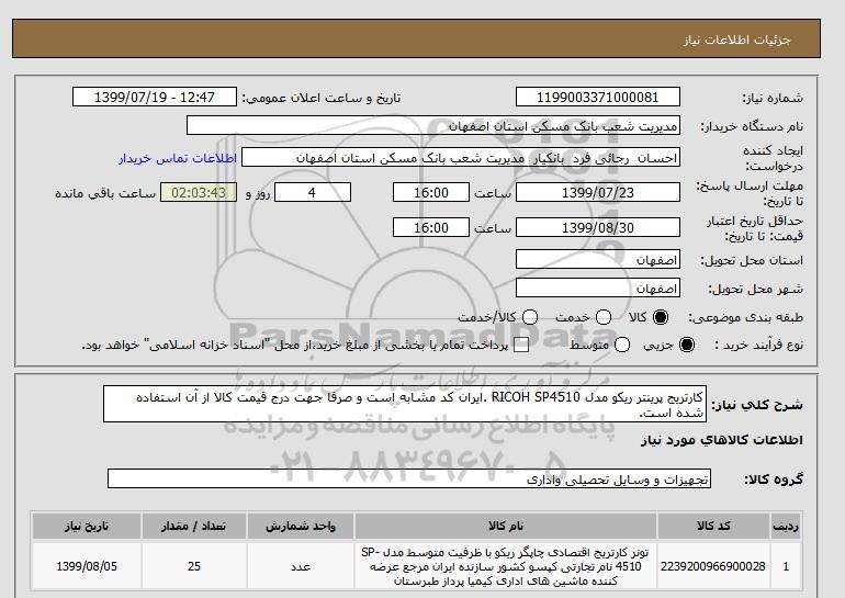 شرح کلی نیاز: کارتریج پرینتر ریکو مدل RICOH SP4510 .ایران کد مشابه است و صرفا جهت درج قیمت کالا از آن استفاده شده است.