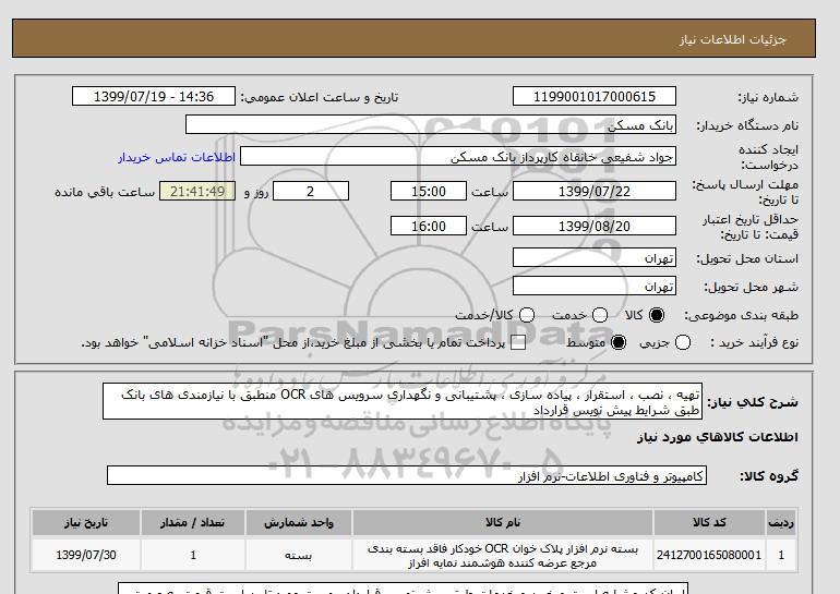 شرح کلی نیاز: تهیه ، نصب ، استقرار ، پیاده سازی ، پشتیبانی و نگهداری سرویس های OCR منطبق با نیازمندی های بانک طبق شرایط پیش نویس قرارداد