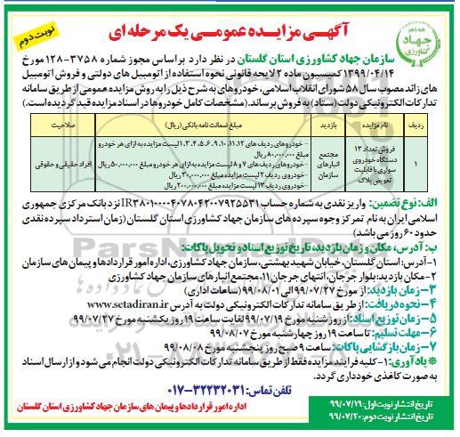 سازمان جهاد کشاورزی استان گلستان در نظر دارد براساس مجوز شماره 3758-128 مورخ 99.4.14 کمیسیون ماده 2 لایحه قانونی نحوه استفاده از اتومبیل های دولتی و فروش اتومبیل های زائد مصوب سال 58 شورای انقلاب اسلامی خودروهای به شرح ذیل را به روش مزایده عمومی از طریق سامانه تدارکات الکترونیکی دولت ستاد به فروش برساند.