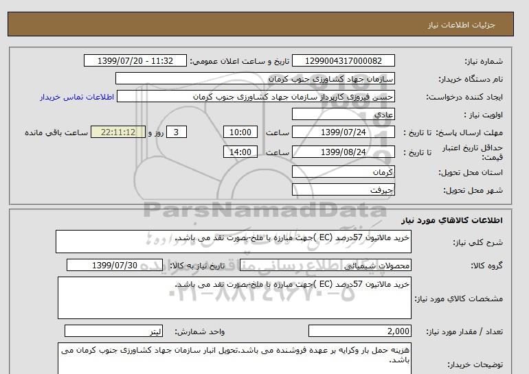 شرح کلی نیاز: خرید مالاتیون 57درصد (EC )جهت مبارزه با ملخ-بصورت نقد می باشد.