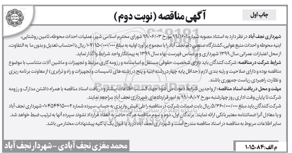 شهرداری نجف آباد در نظر دارد به استناد مصوبه شماره 99/1601 مورخ 99.6.3 شورای محترم اسلامی شهر عملیات احداث محوطه، تامین روشنایی، ابنیه محوطه و احداث منبع هوایی کشتارگاه صنعتی دام نجف آباد را با مجموع براورد اولیه به مبلغ 107.150.000.000 ریال با احتساب تعدیل و بدون مابه التفاوت، از محل اعتبارات عمرانی سال 1399 شهرداری و براساس فهرست بها سال 1399 به پیمانکار واجد شرایط واگذار نماید.