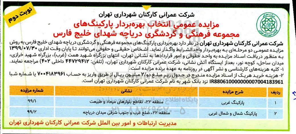 شرکت عمرانی کارکنان شهرداری تهران در نظر دارد بهره برداری پارکینگ های مجموعه فرهنگی و گردشگری دریاچه شهدای خلیج فارس به روش مزایده عمومی دو مرحله ای به بهره بردار واجد الشرایط واگذار نماید