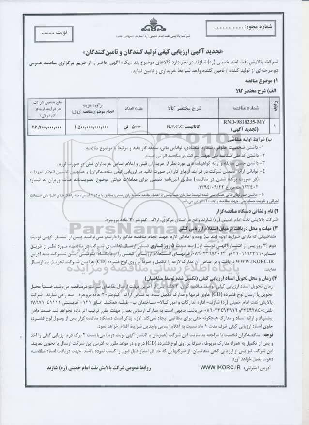 RND-9818235-MY (تجدید آگهی) کاتالیست R.F.C.C 5000 تن  1.500.000.000.000 26.700.000.000