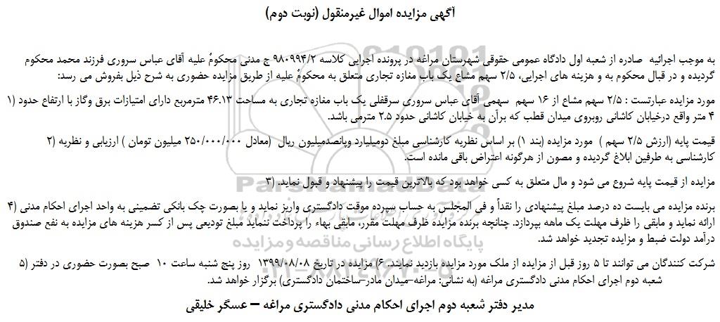 به موجب اجرائیه  صادره از شعبه اول دادگاه عمومی حقوقی شهرستان مراغه در پرونده اجرایی کلاسه 980994/2 ج مدنی محکومٌ علیه آقای عباس سروری فرزند محمد محکوم گردیده و در قبال محکوم به و هزینه های اجرایی، 2/5 سهم مشاع یک باب مغازه تجاری متعلق به محکومٌ علیه از طریق مزایده حضوری به شرح ذیل بفروش می رسد: