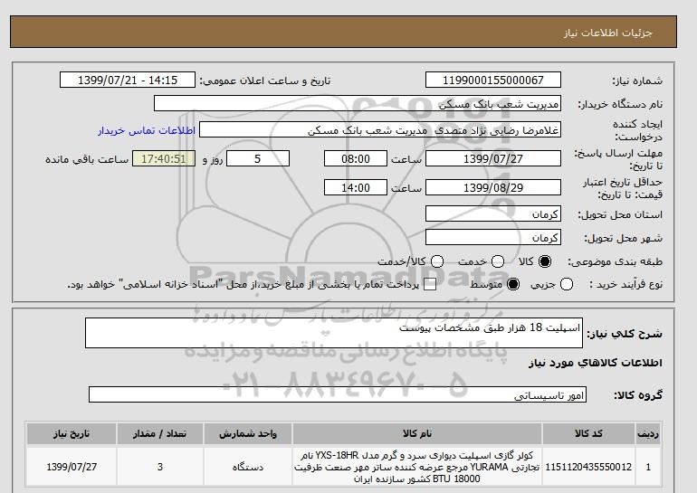 شرح کلی نیاز: اسپلیت 18 هزار طبق مشخصات پیوست