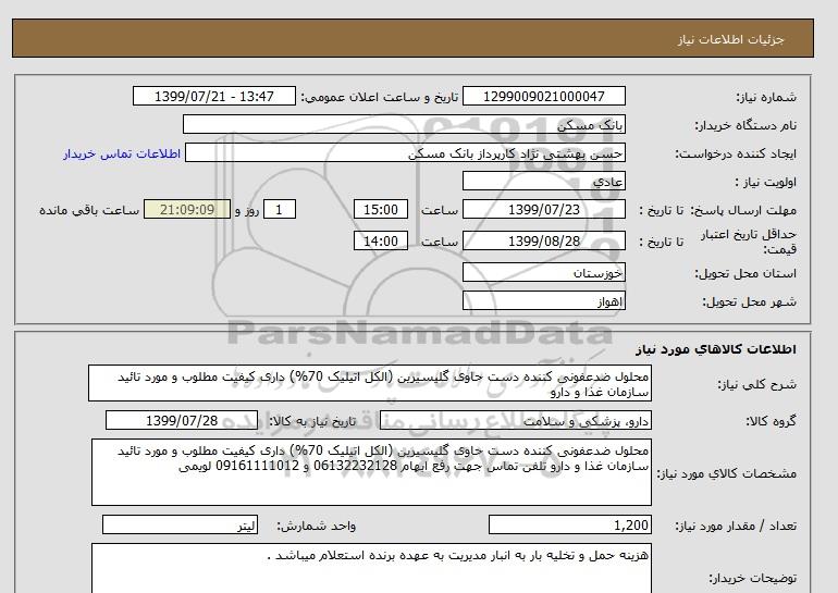 مشخصات کالای مورد نیاز: محلول ضدعفونی کننده دست حاوی گلیسیرین (الکل اتیلیک 70%) داری کیفیت مطلوب و مورد تائید سازمان غذا و دارو تلفن تماس جهت رفع ابهام 06132232128 و 09161111012 لویمی