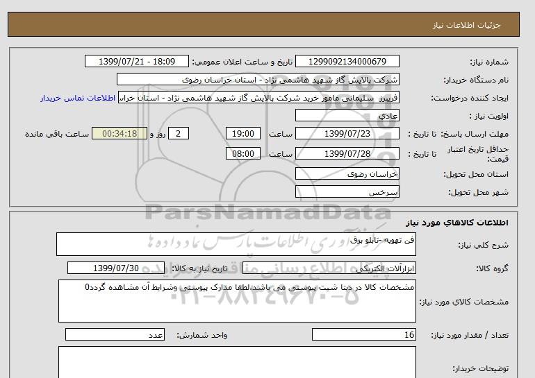 نام دستگاه خریدار:شرکت پالایش گاز شهید هاشمی نژاد - استان خراسان رضوی